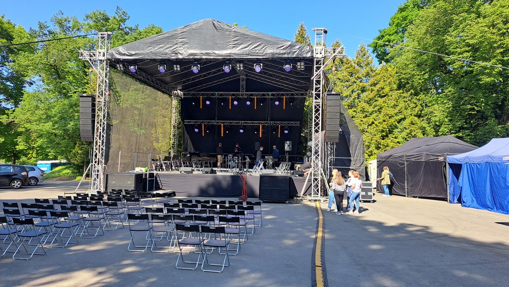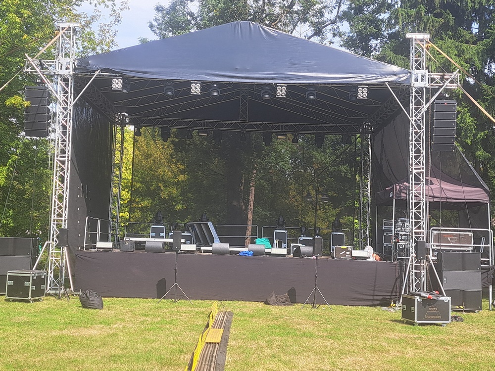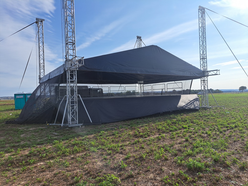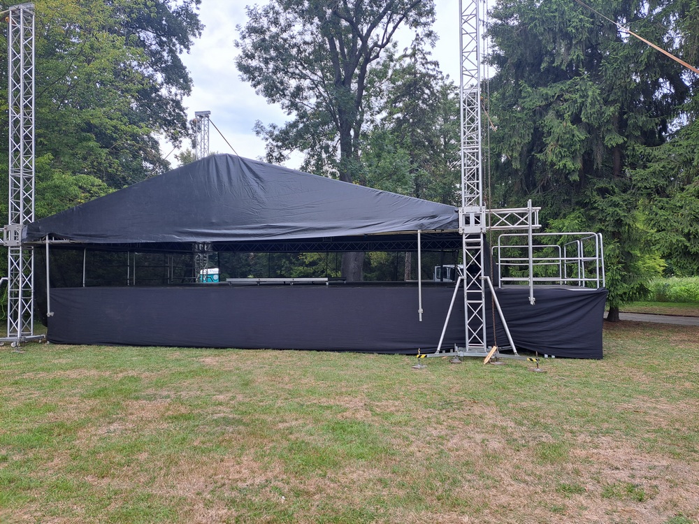 Estrada z zadaszeniem 10x8m z kompletem siatek czarnych do wypożyczenia w firmie