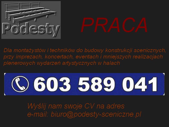 • Jeżeli: twój stan zdrowia jest bardzo dobry, jesteś dyspozycyjny i przygotowany na częste wyjazdy to ta praca jest właśnie dla Ciebie. Wyślij nam swoje CV na adres e-mail: biuro@podesty-sceniczne.pl