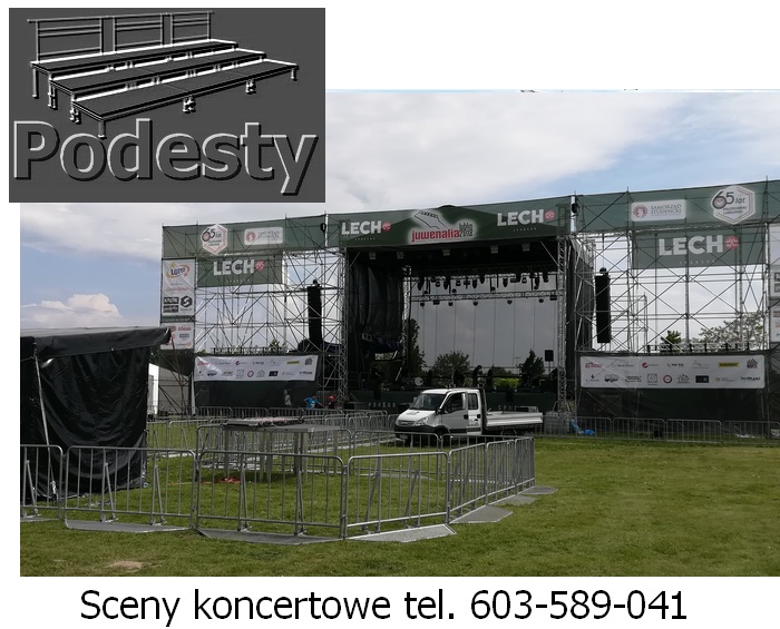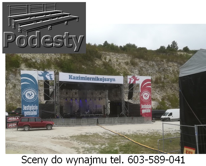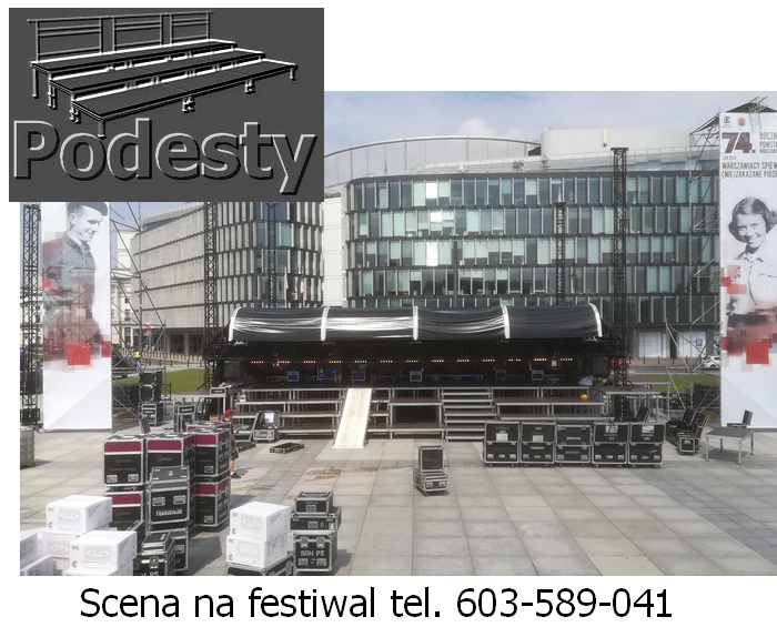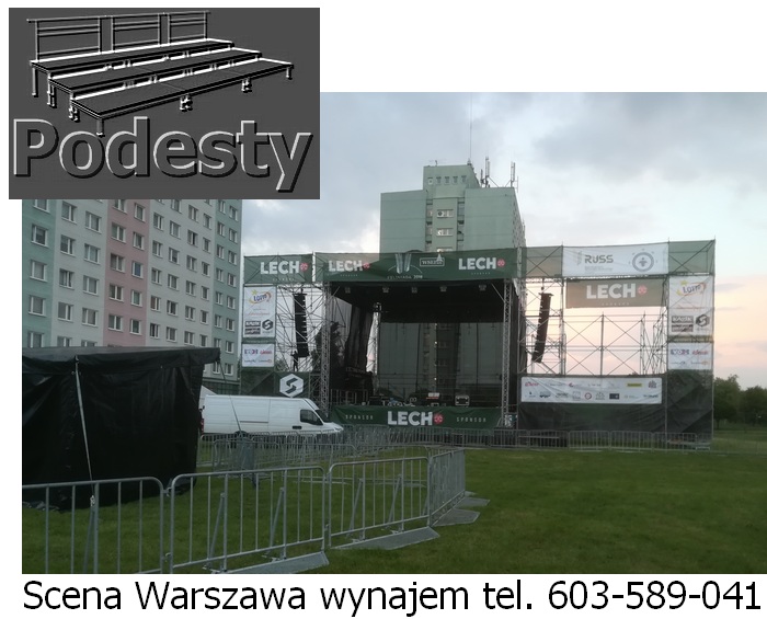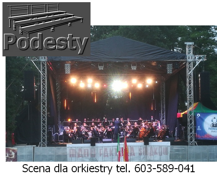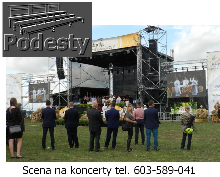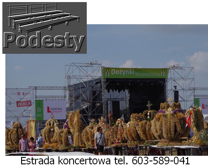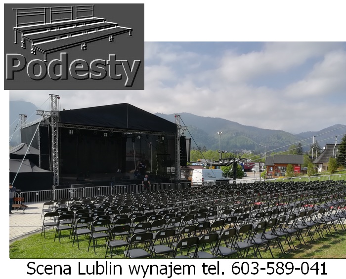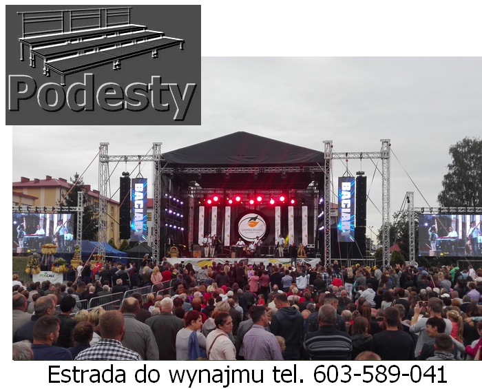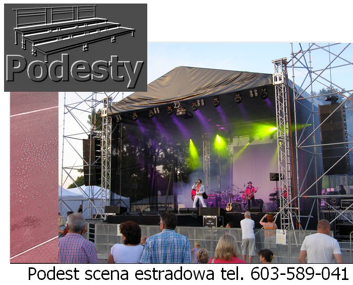 Estrada na wydarzenia artystyczne i koncerty, dla aktorów i artysów w róznych wielkościach i wysokościach zadaszeń. Konstrukcje z płynną regulacją wysokości. System QUADRO. Montaż scen estradowych odbywa się bardzo szybko. Zadaszenie estradowe poszycie materiał plandeka. Podesty sceny modułowe, nogi teleskopowe lub konstrukcja layher dająca dużą dowolność przy tworzeniu kształtu podłogi, pokryta sklejką anty poślizgową. Do dyspozycji ściany boczne siatka czarna lub plandeka. Nasz sprzęt jest nowy, estetyczny i bezpieczny posiada wszystkie niezbędne atesty. Działamy niemal bez przerwy przez 365 dni w roku. Każdego dnia, gdzieś w Polsce, nasze sceny na wynajem służą za miejsce występów artystów i gwiazd każdego formatu